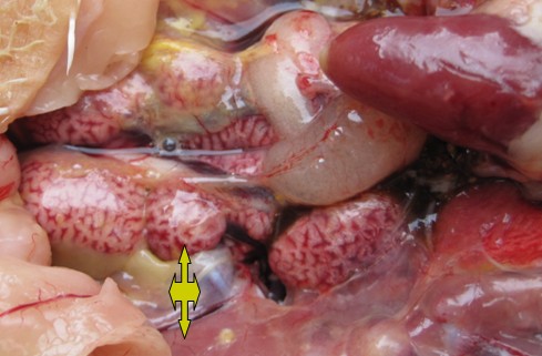 解剖癥狀:腎臟高度腫脹、蒼白,腎小管和輸尿管變粗,內(nèi)充滿白色尿酸鹽,俗稱“花斑腎”,嚴(yán)重者在心包、肝臟、腸道表面有白色霜樣物沉積。泄殖腔內(nèi)充滿白色石灰樣稀糞;病程較長(zhǎng)者,繼發(fā)大腸桿菌和支原體感染,形成氣管炎、肝周炎等敗血癥變化