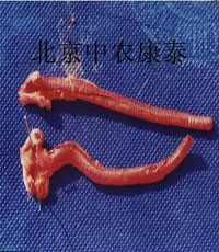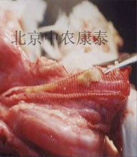 肉雞 發(fā)病初期氣管的出血性變化;中期氣管發(fā)紅、發(fā)紫,氣管內(nèi)有黃白色干酪樣物。